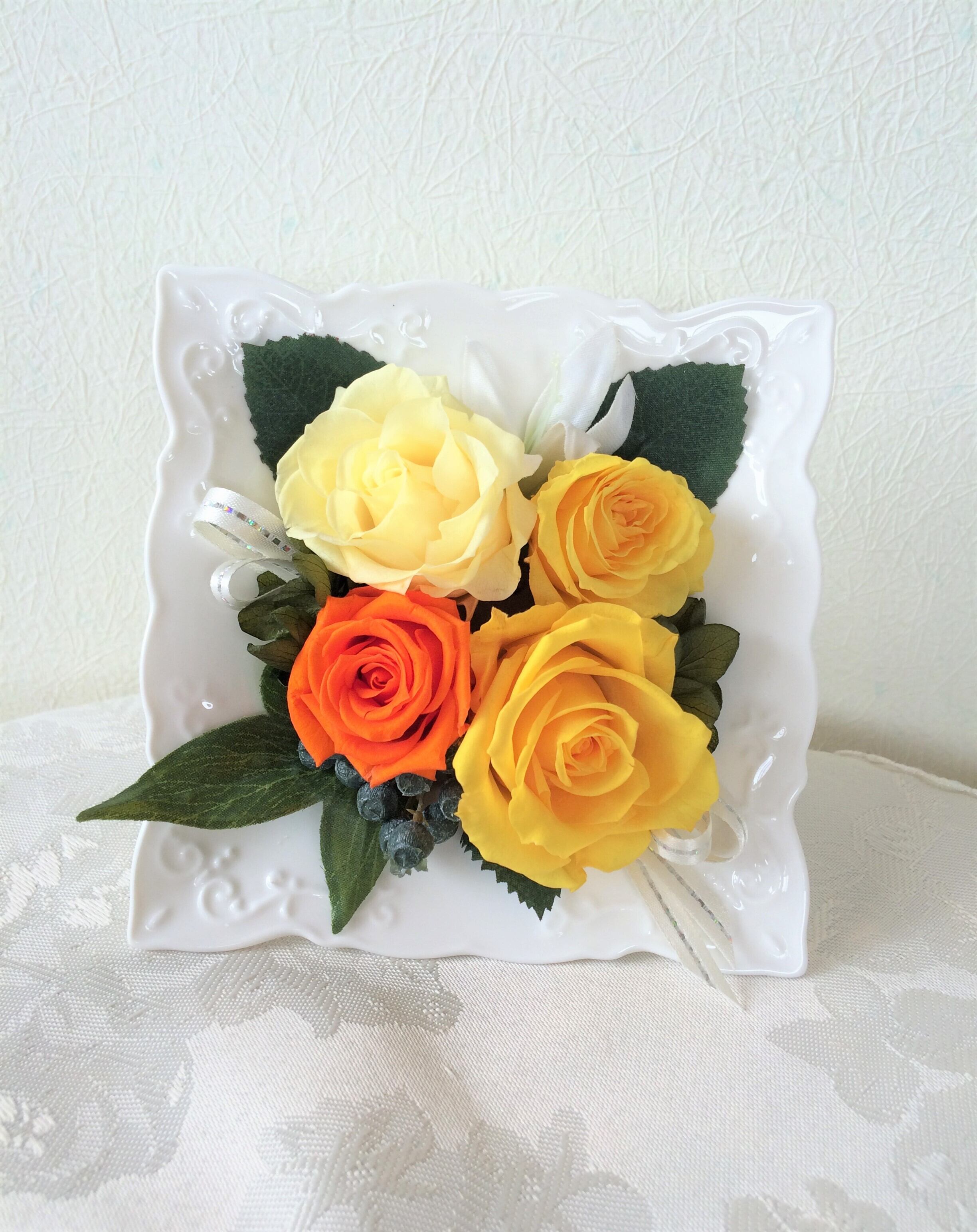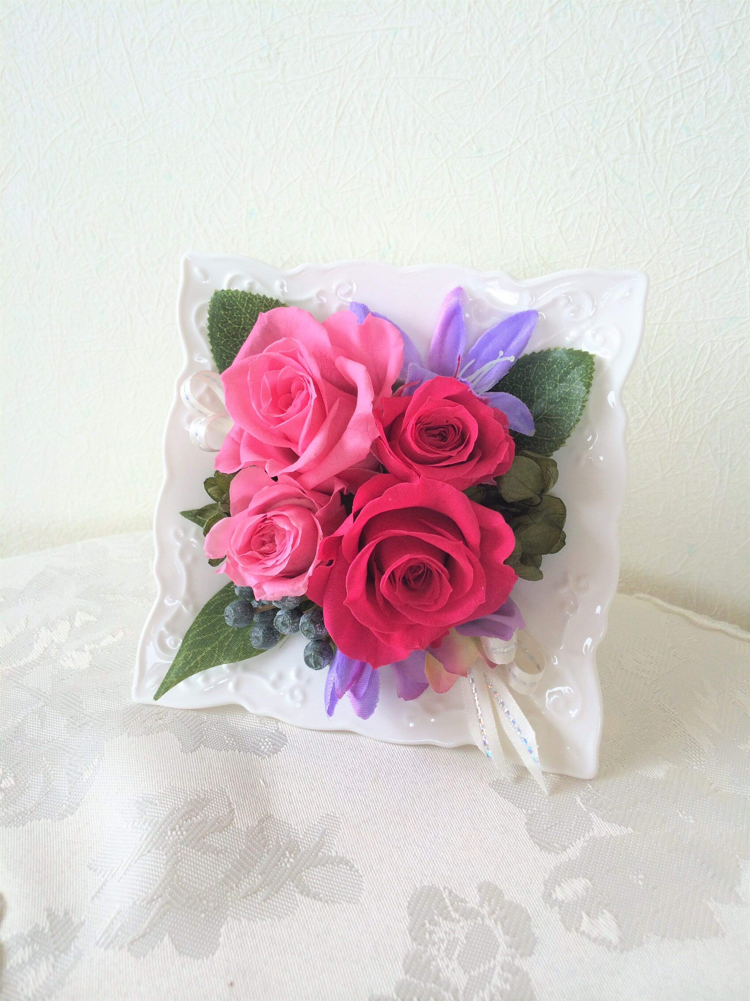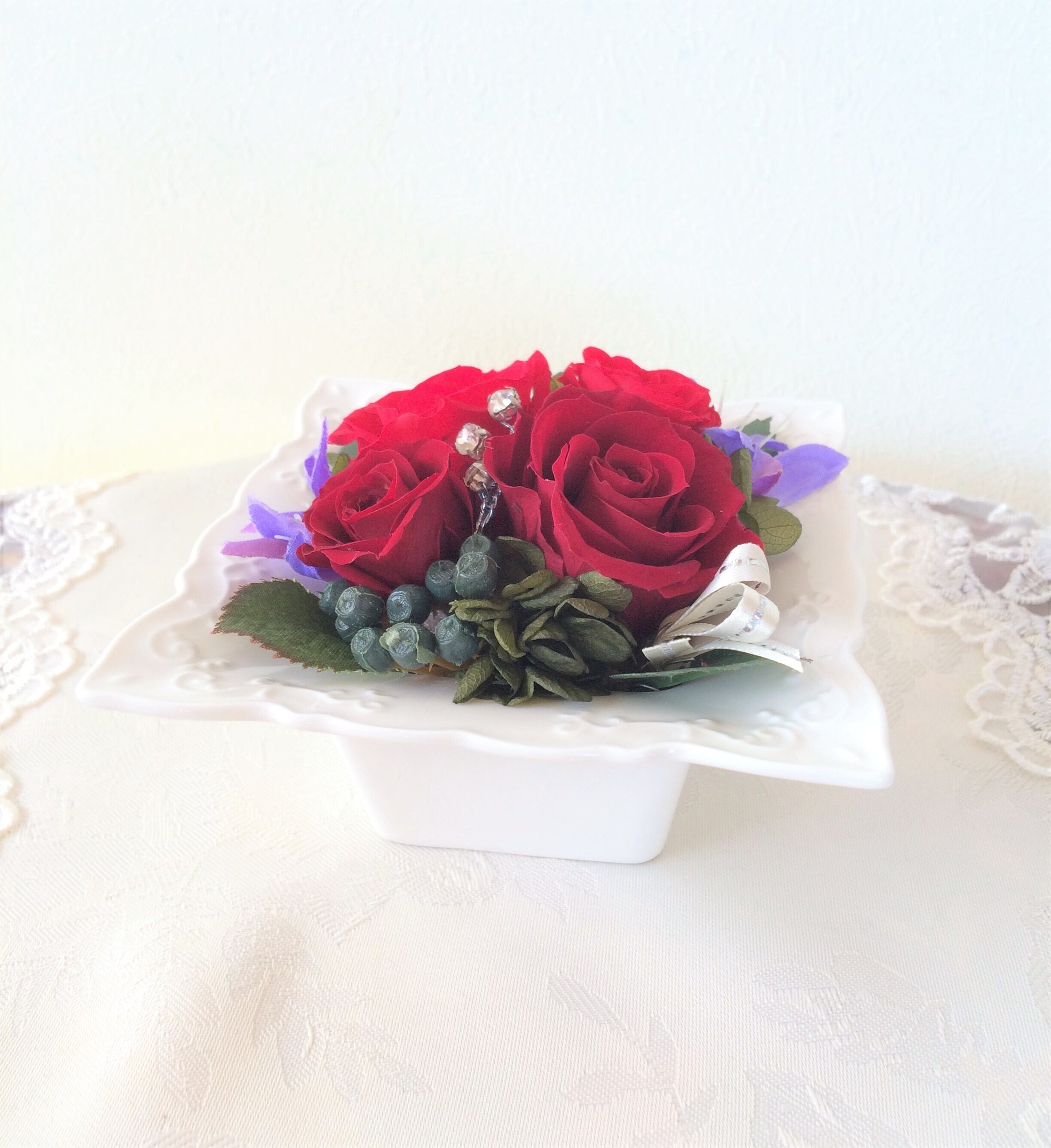 プリザーブドフラワーのバラが4輪も入ったとても華やかな作品。