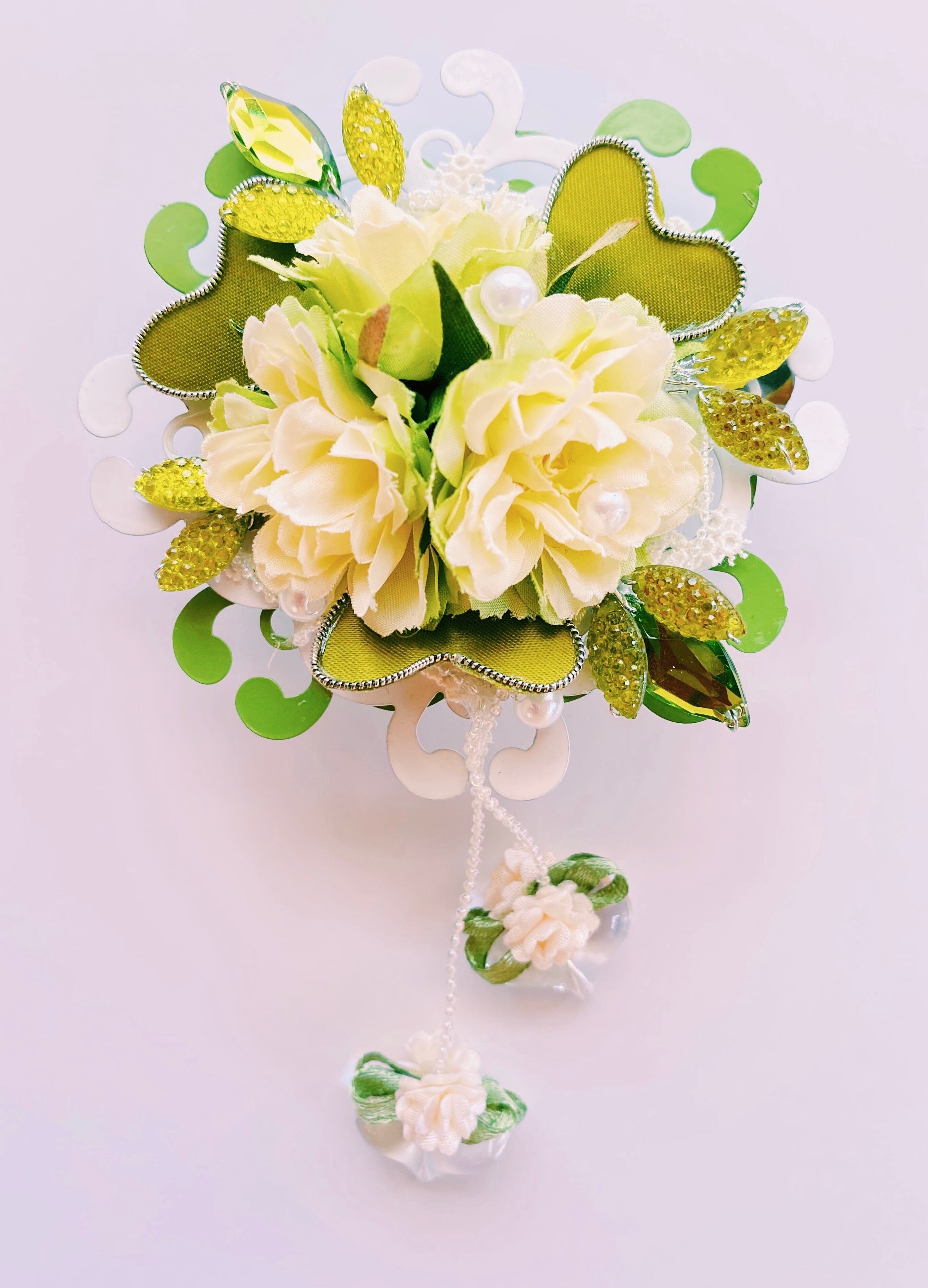 リアンオーナメントという金属製のアクセサリーベースを使ったコサージュです。